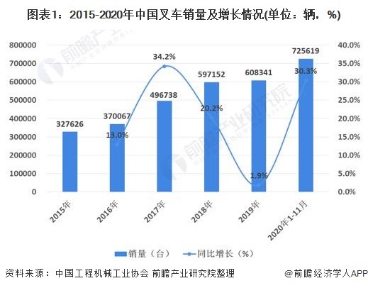 2020年受益于国内新冠疫情得到迅速控制,国内制造业、物流业的快速恢复,叉车市场需求快速增长。2020年1-11月份的累计销量达到72.56万辆,与2019年同期相比增长30.3%。
