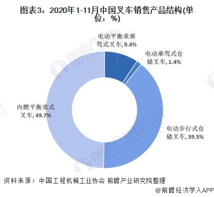 2020年1-11月份的累计销量达到72.56万辆,与2019年同期相比增长30.3%,其中电动式叉车销量占比达到50.3%,比2019年增长1.2个百分点,主要是受环保要求和室内作业环境要求的驱动,电动叉车需求持续增长。