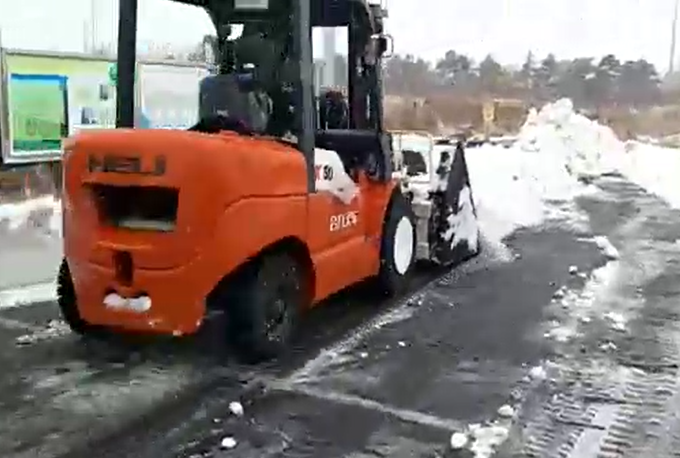 小5T选配倾翻斗+倾翻叉整车应用于除雪现场