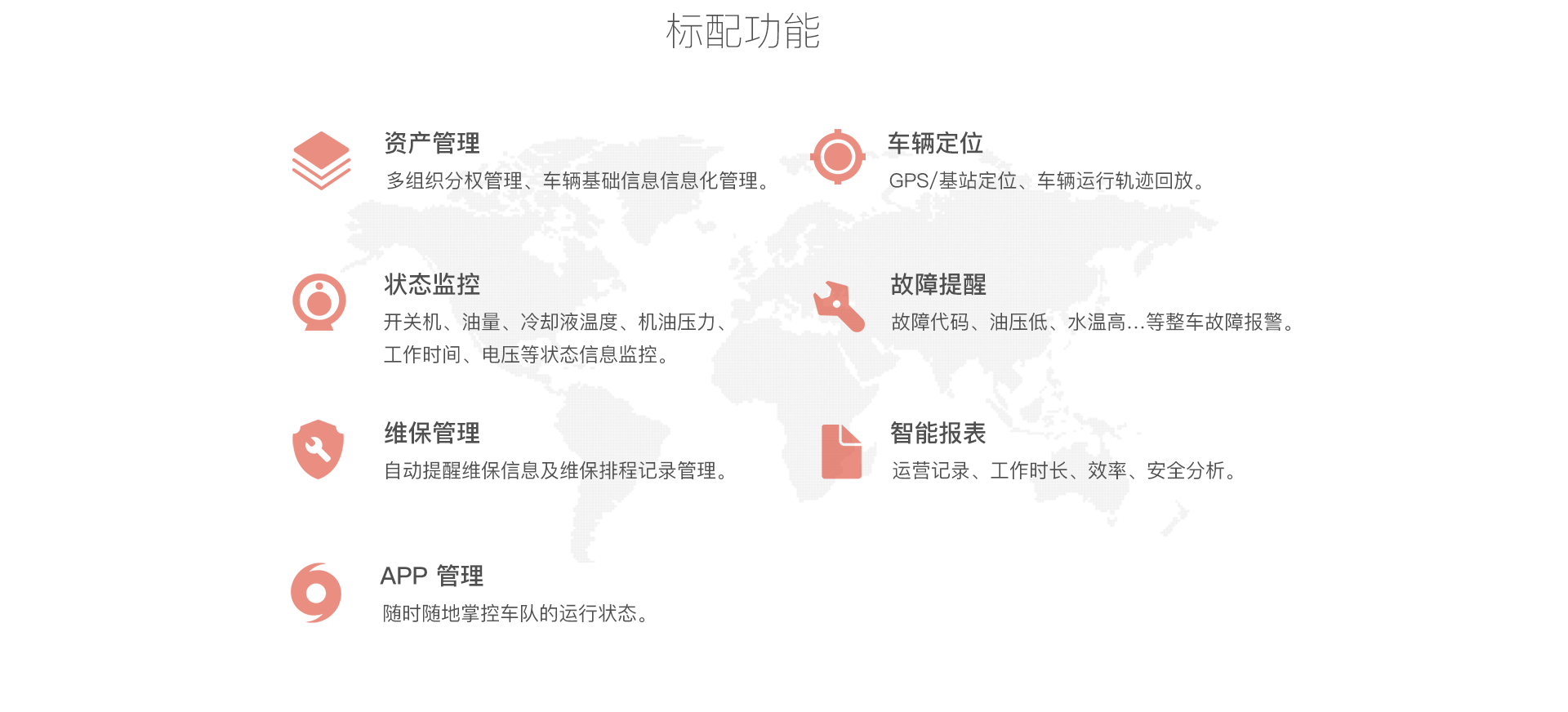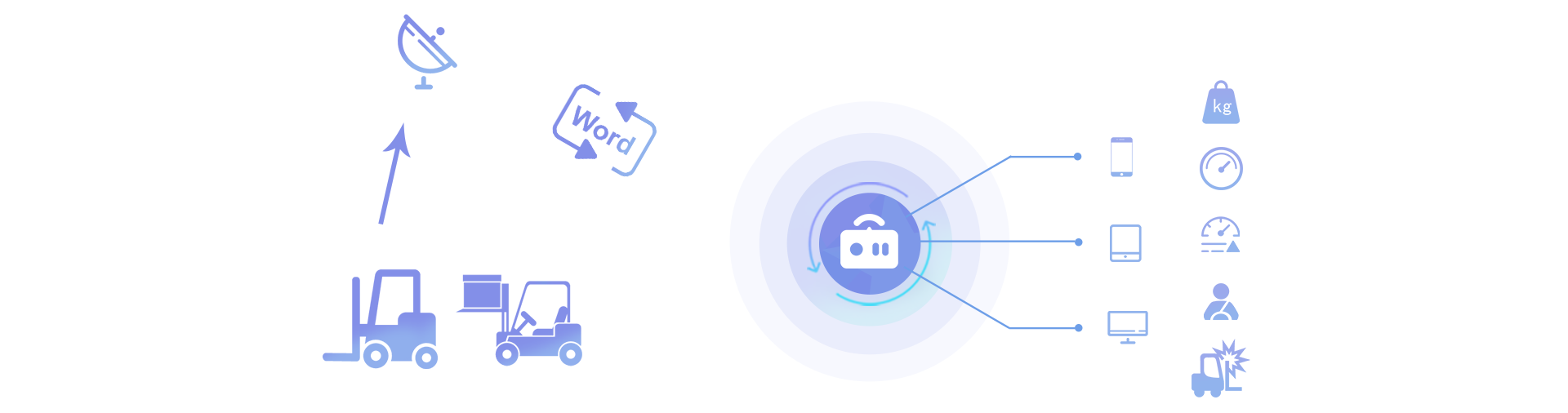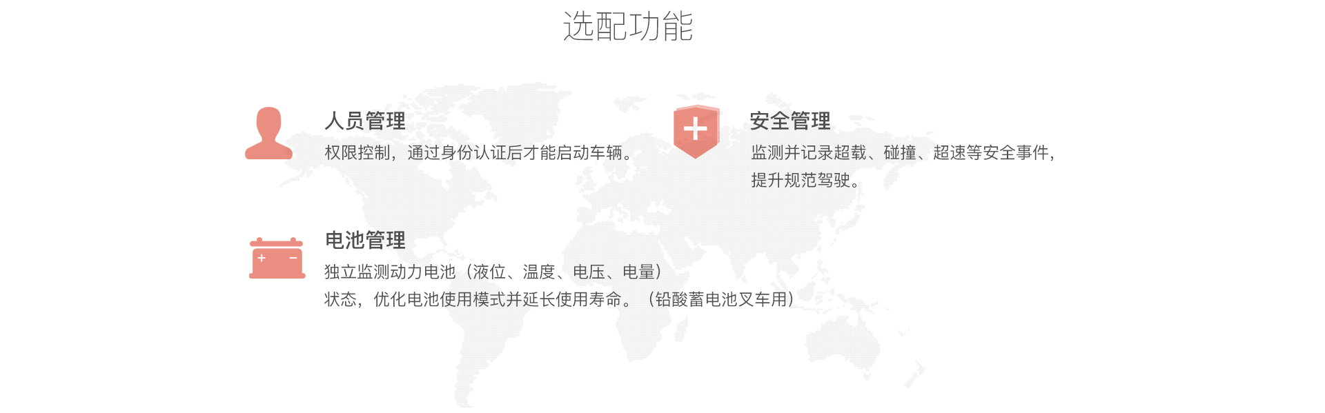 通过传感器获知叉车状态和人员作业情况并接入互联网、驾驶员、维修工、管理员等即可通过电脑、手机、车载设备终端了解车辆设备状态、使用状态、因此能随时随地掌控情况、实现高效的车队管理。